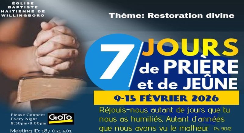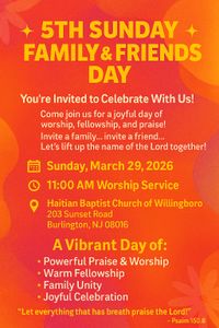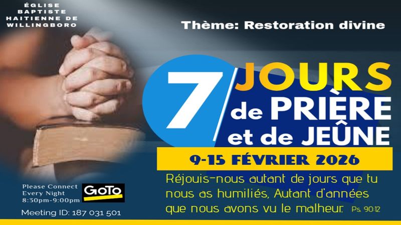 Thank you for visiting our website. We hope that it will be a blessing to you. Here you will be informed about what our church has to offer. If you live in the area, are not yet affiliated to a church, or if you are just visiting, come and worship with us. You will find that we are a congregation that has a deep commitment to the Lord Jesus-Christ, a firm belief in God the Father, and a total submission to the Holy Spirit. Although our services are mainly conducted in Haitian-Creole and French you will still feel our fellowship welcoming and caring. We see to it that we seek each other's edification in christian love.